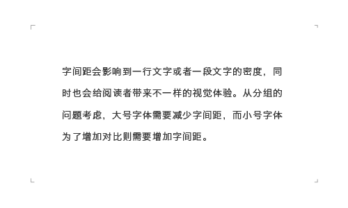 字間距會影響到一行文字或者一段文字的密度,同時也會給閱讀者帶來不一樣的視覺體驗。從分組的問題考慮,大號字體需要減少字間距,而小號字體為了增加對比則需要增加字間距。